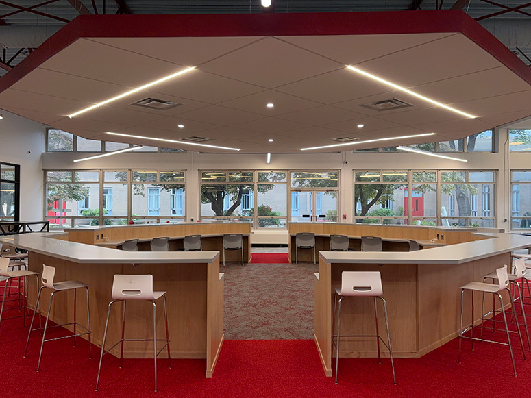 AOS collaborated with the school and the Archdiocese to transform the former library into a comprehensive Wellness Center. This new center is dedicated to supporting the academic, mental, and spiritual well-being of the whole student. The design includes a welcoming student lounge and gathering area, a guidance suite, small collaborative workspaces, conference rooms, a spiritual gathering space, and an IT support area.